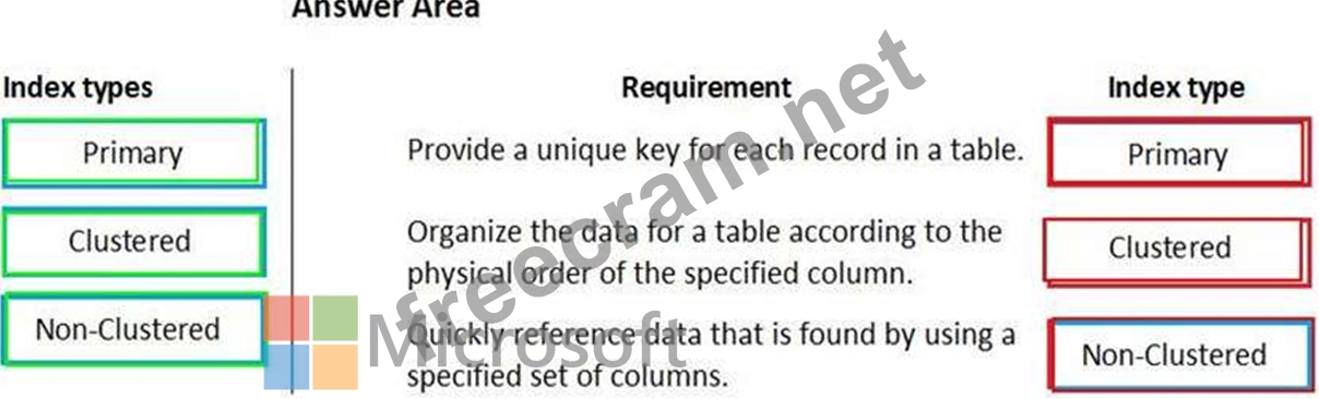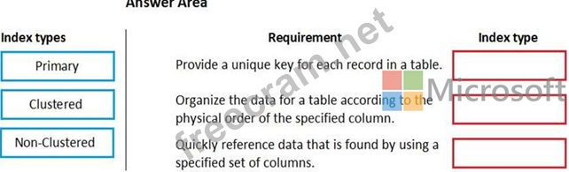Which types of indexes should you use? To answer, drag the appropriate types of indexes to the correct requirements. Each type of index may be used once, more than once, or not at all. You may need to drag the split bar between panes or scroll to view content.