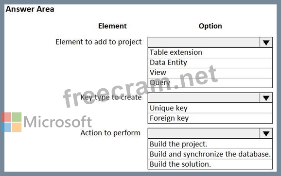 https://docs.microsoft.com/en-us/dynamics365/fin-ops-core/dev-itpro/dev-tools/build-operations#synchronizing- the-database-at-each-build Design and Develop AOT Elements Testlet 2 Case study This is a case study. Case studies are not timed separately. You can use as much exam time as you would like to complete each case. However, there may be additional case studies and sections on this exam. You must manage your time to ensure that you are able to complete all questions included on this exam in the time provided.