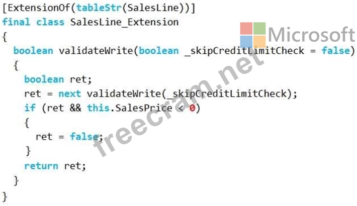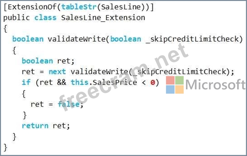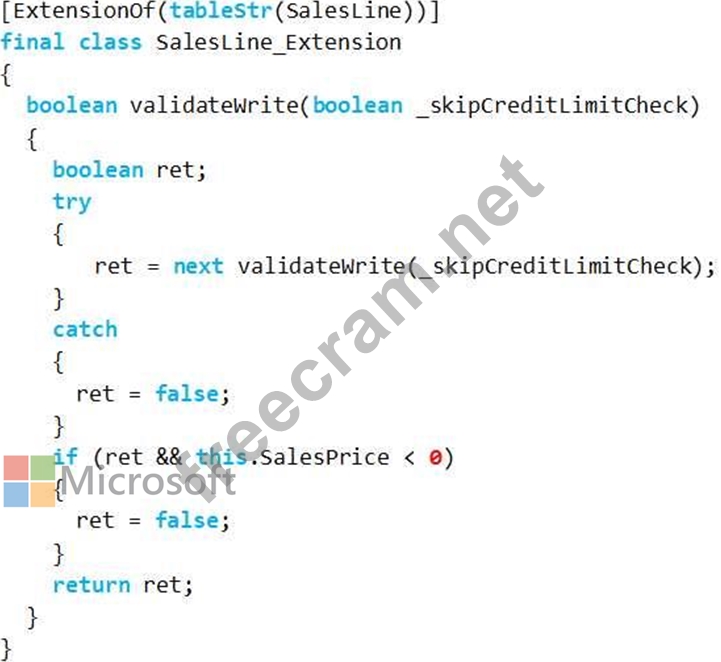 You are a Dynamics 365 Finance developer. You must extend the validateWrite method of the SalesLine table by using Chain of Command. The value of a variable named SalesPrice must be greater than or equal to zero when adding new lines. You need to create an extension class. Which two code segments can you use? Each correct answer presents a complete solution. NOTE: Each correct selection is worth one point.