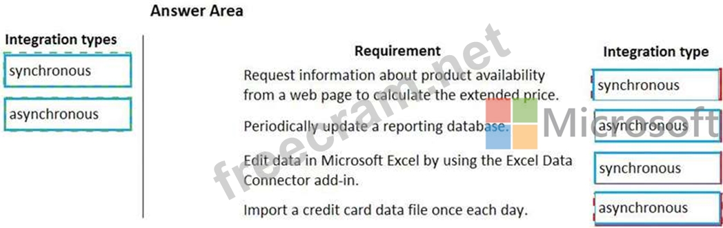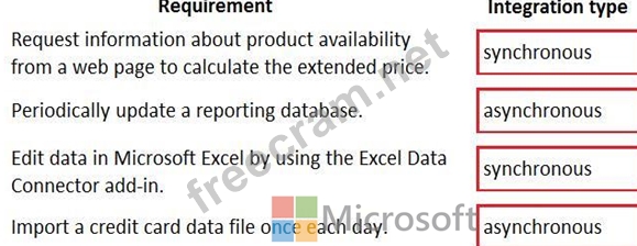 Which integration types should you use? To answer, drag the appropriate integration types to the correct requirement. Each integration type may be used once, more than once, or not at all. You may need to drag the split bar between panes or scroll to view content.