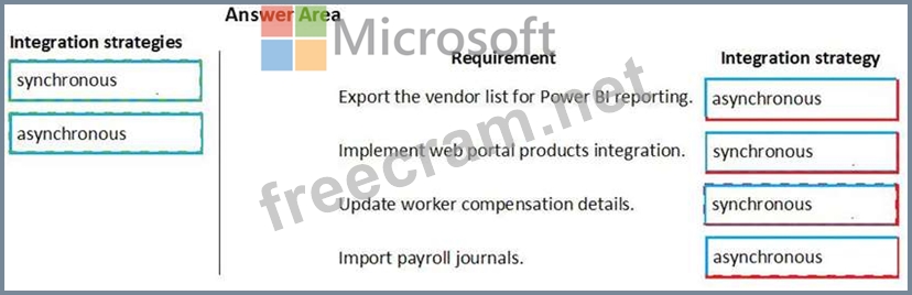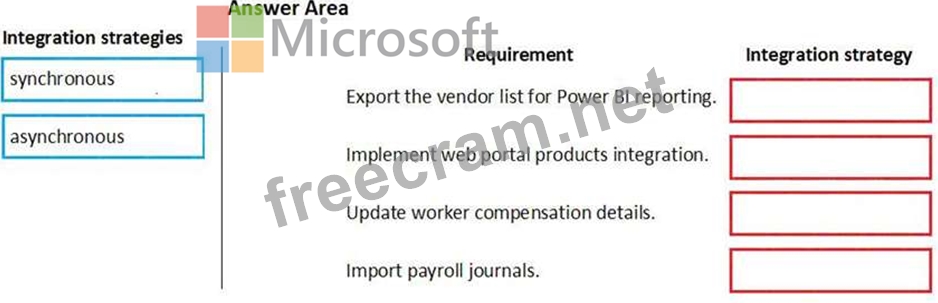 Which integration strategies should you use? To answer, drag the appropriate integration strategies to the correct requirements. Each integration strategy may be used once, more than once, or not at all. You may need to drag the split bar between panes or scroll to view content.