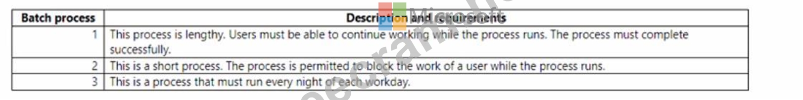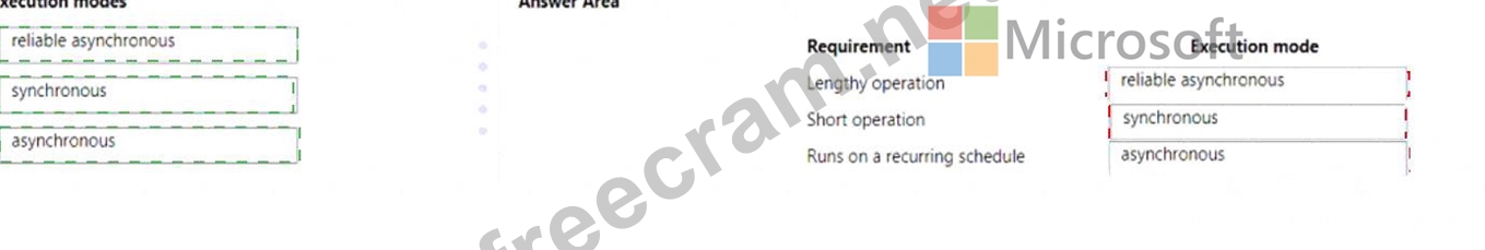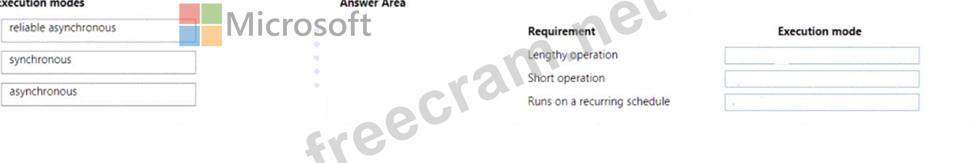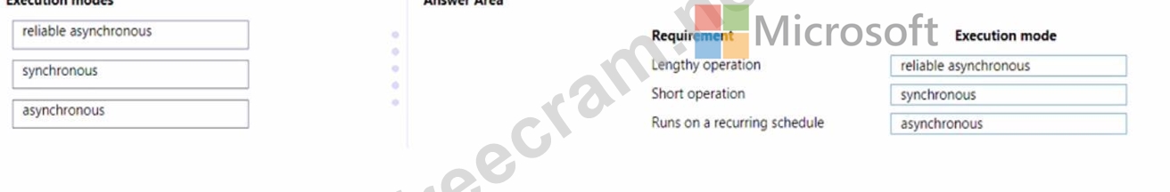 Which execution modes should you use? To answer, drag the appropriate execution modes to the correct requirements. Each execution mode may be used once, more than once, or not at all. You may need to drag the split bar between panes or scroll to view content.