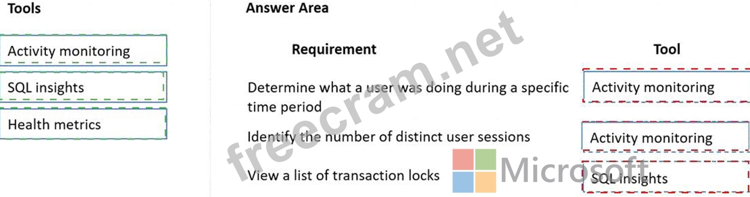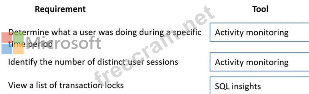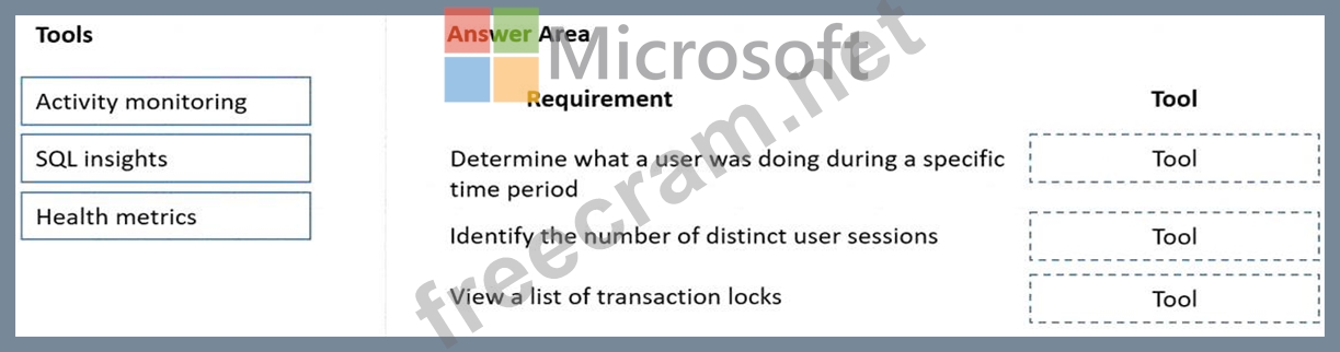 Which tool should you use? To answer, drag the appropriate tools to the correct requirements. Each tool may be used once, more than once, or not at all. You may need to drag the split bar between panes or scroll to view content.