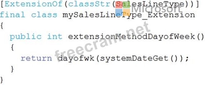 You must extend the class SalesLineType and add a new method that returns the day of week for the system's current date as an integer value.