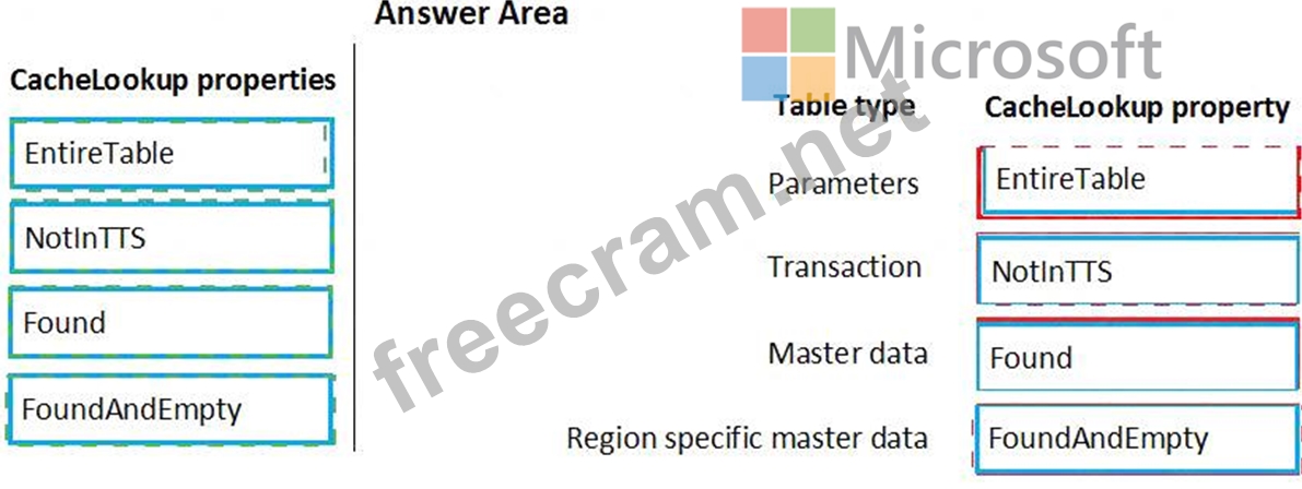 Which CacheLookup properties should you use? To answer, drag the CacheLookup properties to the correct table. Each property may be used once, more than once, or not at all. You may need to drag the split bar between panes or scroll to view content.
