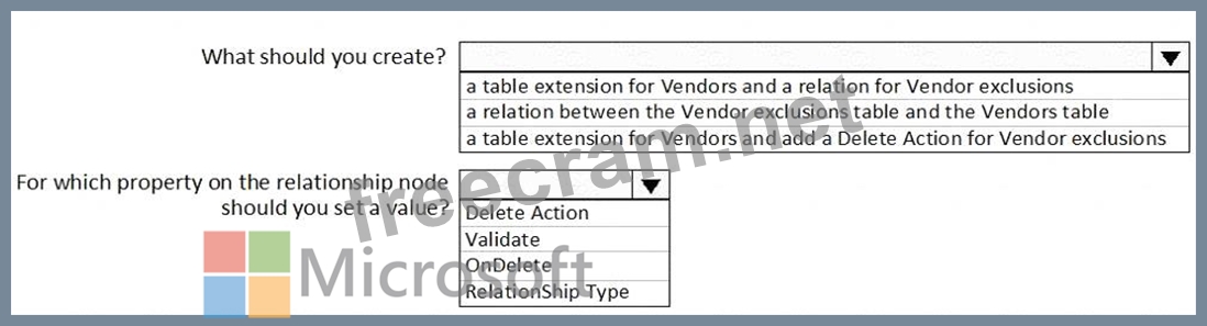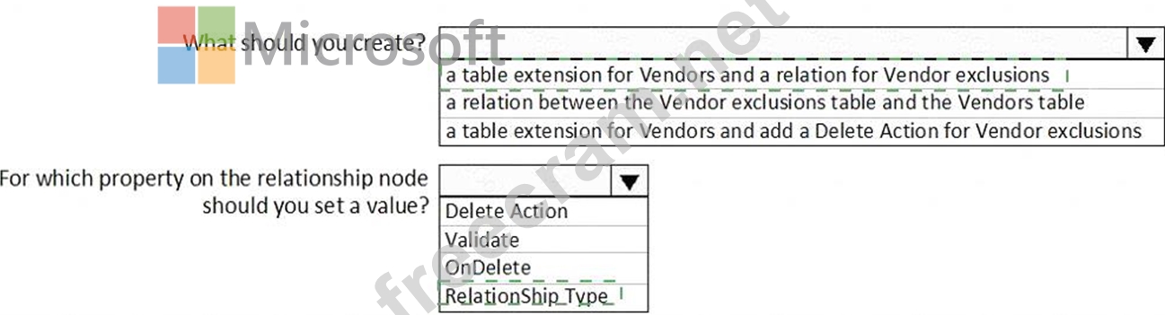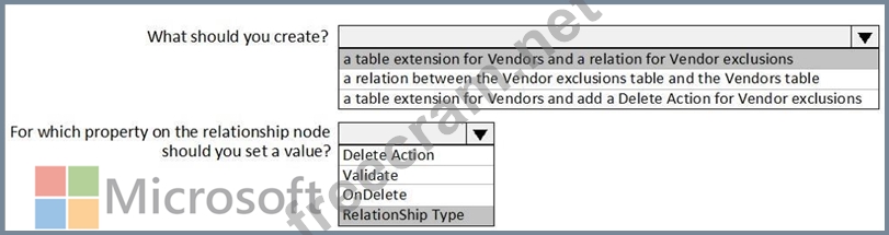 Box 1: a table extension for Vendors and relation for the Vendor exclusions Box 2: RelationShip Type Reference: