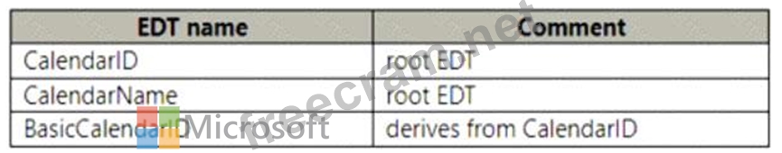 A company uses Dynamics 365 Finance. You are customizing elements for the extended data types (EDTs) shown in the following table.