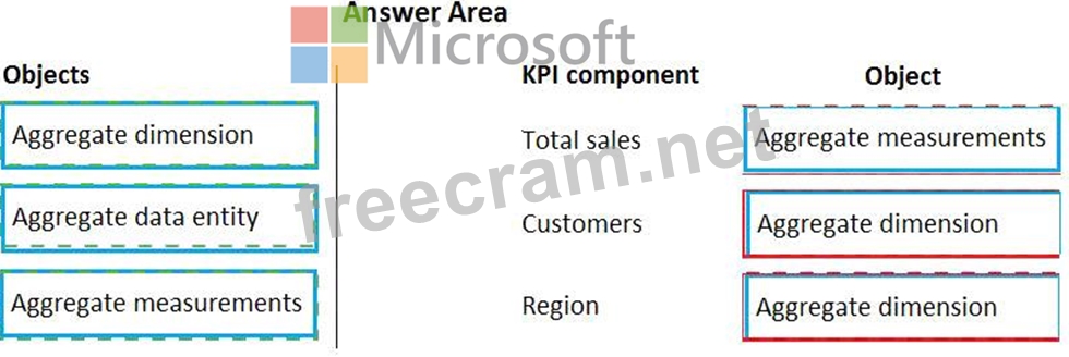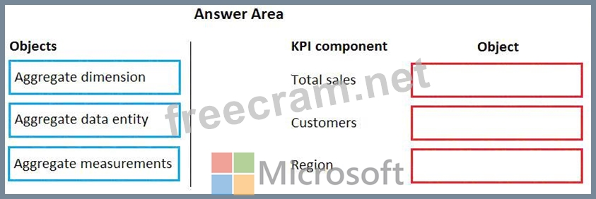 How should you model the KPI? To answer, drag the appropriate objects to the correct KPI components. Each object may be used once, more than once, or not at all. You may need to drag the split bar between panes or scroll to view content.