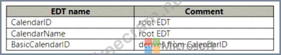 A company uses Dynamics 365 Finance. You are customizing elements for the extended data types (EDTs) shown in the following table.