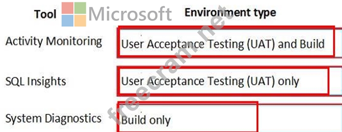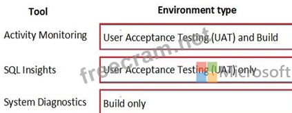 Which Lifecycle Services (LCS) tools should you use for each environment? To answer, drag the appropriate environment types to the correct tools. Each environment type may be used once, more than once, or not at all. You may need to drag the split bar between panes scroll to view content.