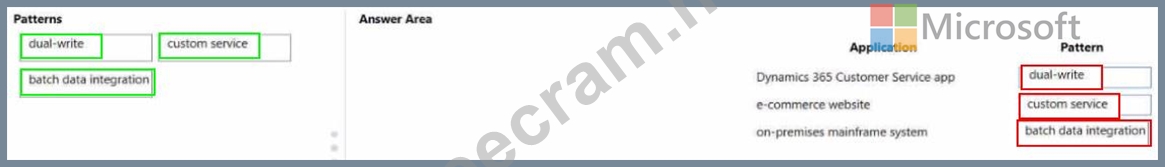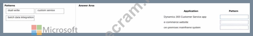Which integration patterns should you use? To answer, drag the appropriate patterns to the correct applications. Each pattern may be used once, more than once, or not at all. You may need to drag the split bar between panes or scroll to view content. NOTE: Each correct selection is worth one point.