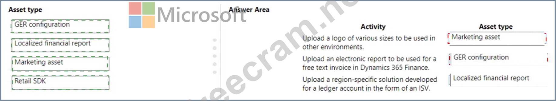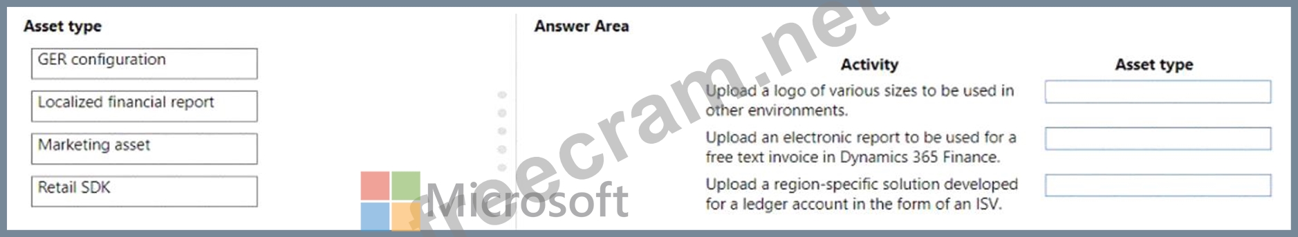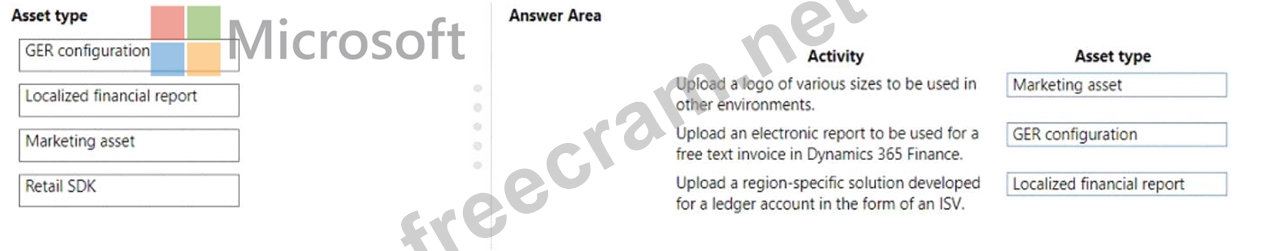 Which asset types should you use? To answer, drag the appropriate asset types to the correct activities. Each asset type may be used once, more than once, or not at all. You may need to drag the split bar between panes or scroll to view content.