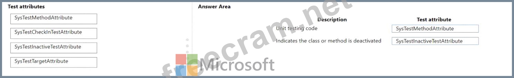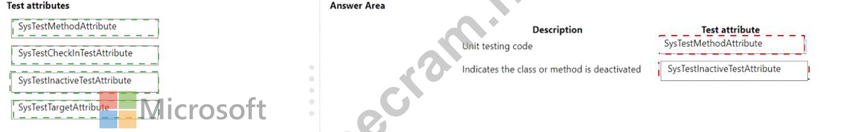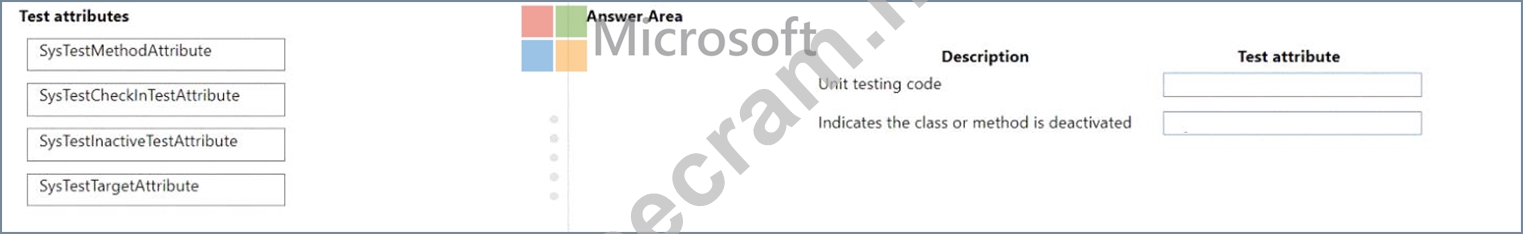 Which test attribute should you use? To answer, drag the appropriate test attributes to the correct descriptions.