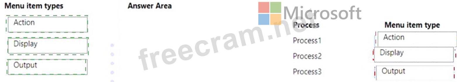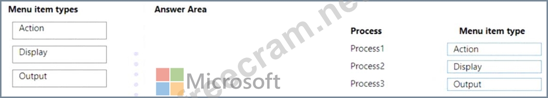 Which menu item types should you use? To answer, drag the appropriate menu item types to the correct processes. Each menu item type may be used once, more than once, or not at all. You may need to drag the split bar between panes or scroll to view content.