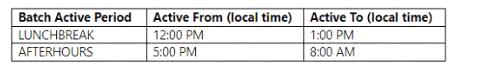 Solution: Create a batch job to have an active period of AFTERHOURS and a batch job recurrence of Daily.