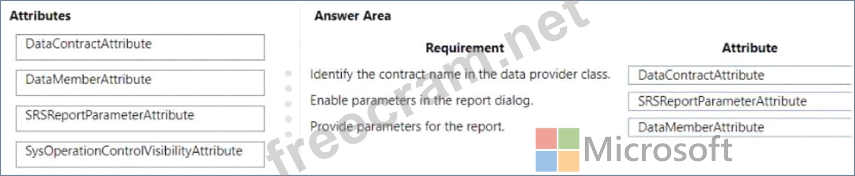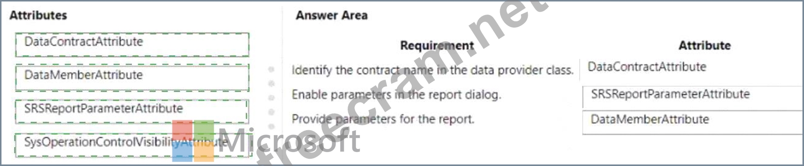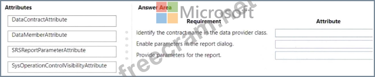 Which attribute should you use? To answer, drag the appropriate attributes to the correct requirements. Each attribute may be used once, more than once, or not at all. You may need to drag the split bar between panes or scroll to view content NOTE: Each correct selection is worth one point.