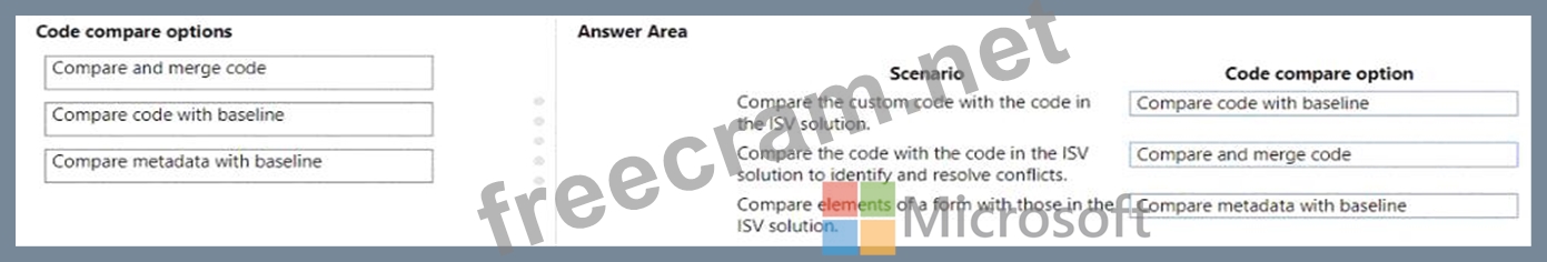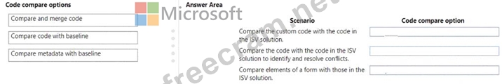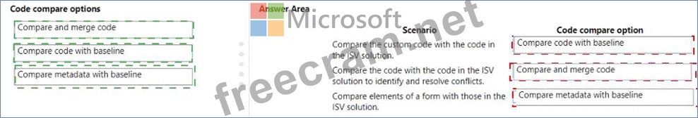 Which code compare option should you use? To answer, drag the appropriate code compare options to the correct scenarios. Each code compare option may be used once, more than once, or not at all. You may need to drag the split bar between panes or scroll to view content.