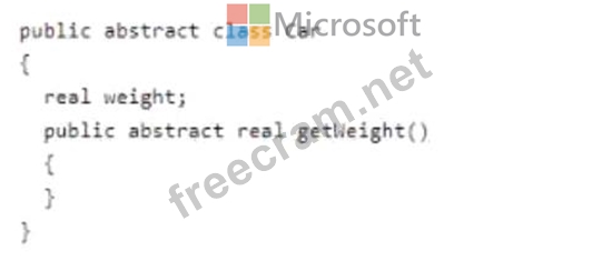 A company uses Dynamics 365 Finance. You implement an abstract class named Car. The Car class has the following: