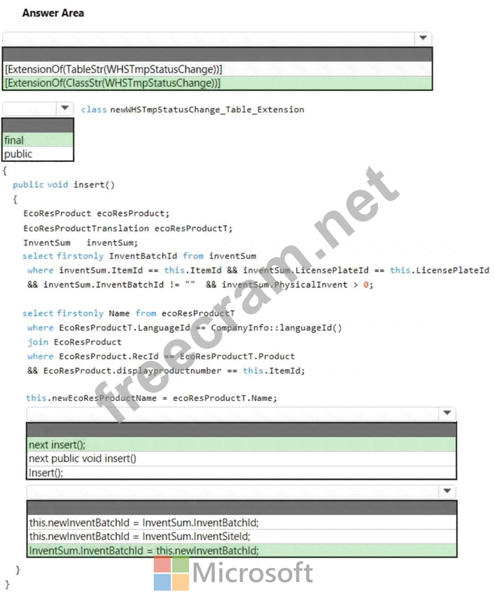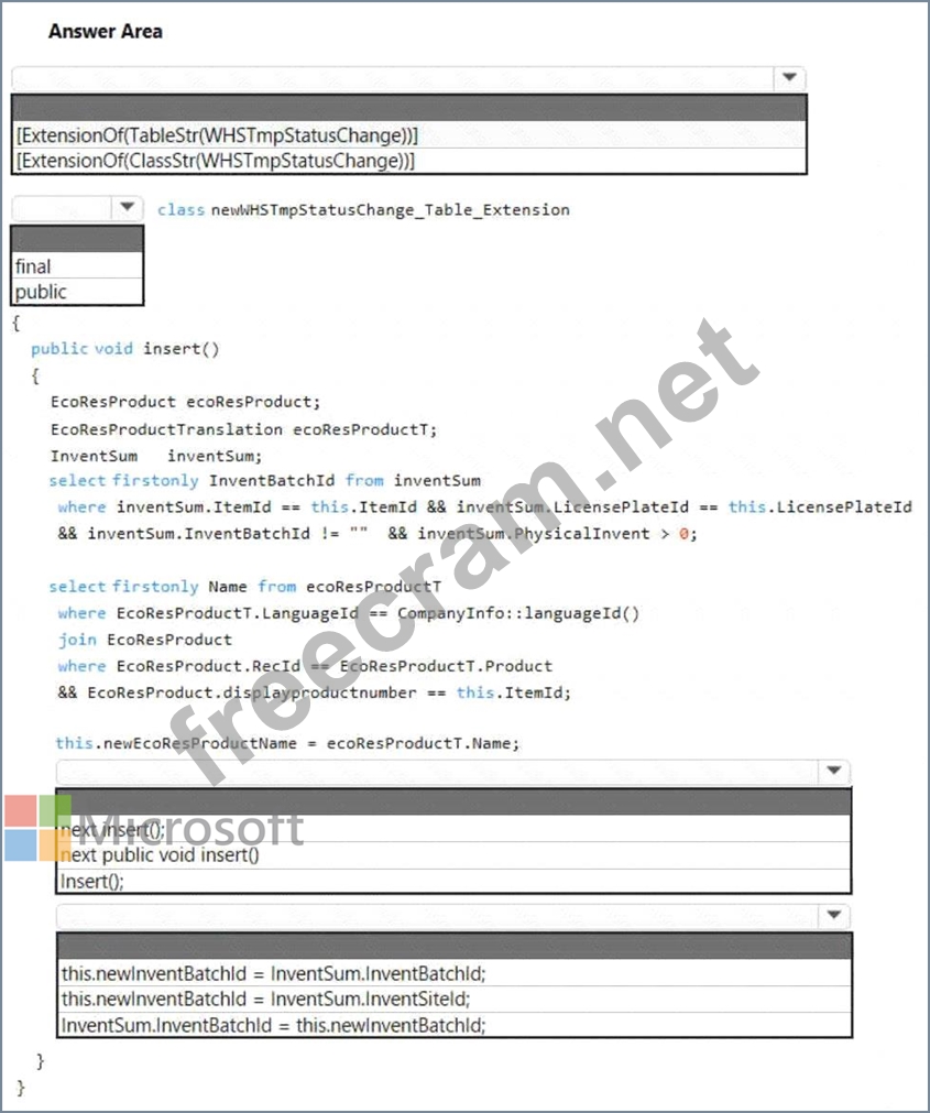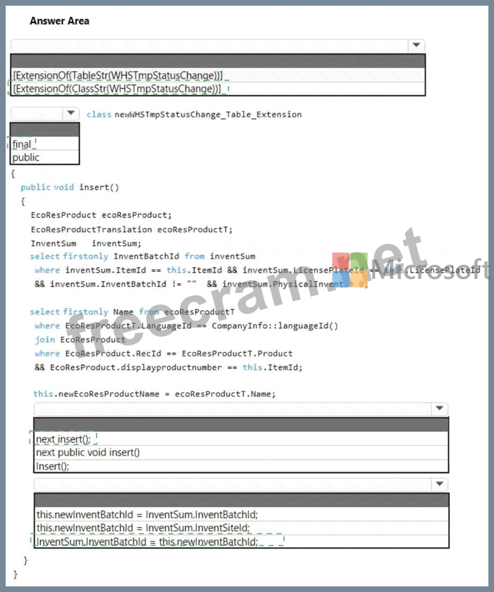 You need to create a chain of command method for inserting the data on the table for the new fields. How should you complete the code? To answer, select the appropriate configuration m the answer area. NOTE: