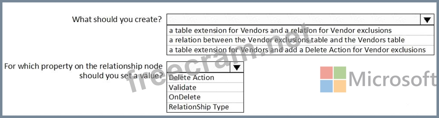 Box 1: a table extension for Vendors and relation for the Vendor exclusions Box 2: RelationShip Type Reference: