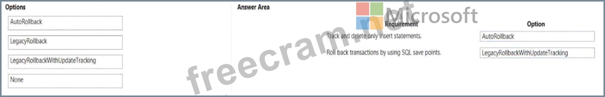You need to select the appropriate TestTransactionMode option for each requirement Which options should you use? To answer, drag the appropriate options to the correct requirements. Each option may be used once, more than once, or not at all. You may need to drag the split bar between panes or scroll to view content.