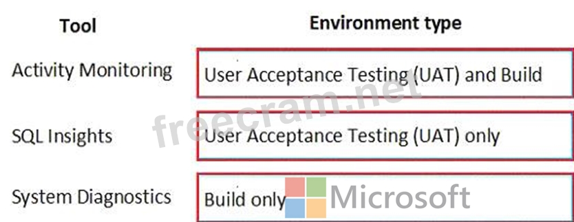 Which Lifecycle Services (LCS) tools should you use for each environment? To answer, drag the appropriate environment types to the correct tools. Each environment type may be used once, more than once, or not at all. You may need to drag the split bar between panes scroll to view content.