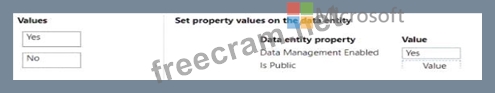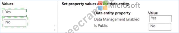 Which values should you set on the data entity properties? To answer, move the appropriate values to the correct data entity properties. You may use each value once, more than once, or not at all- You may need to move the split bar between panes or scroll to view content NOTE: Each correct selection is worth one point.