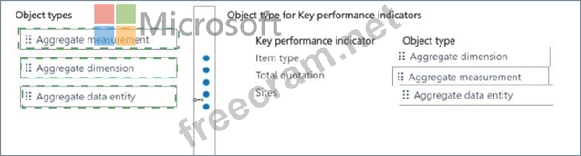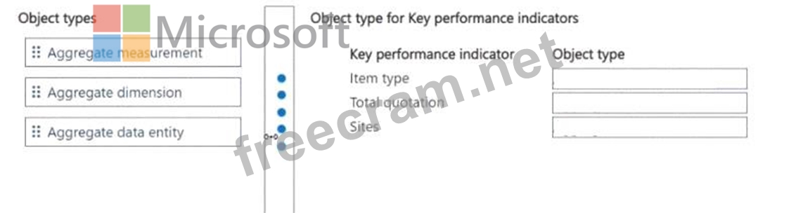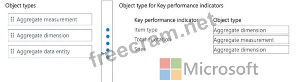 Which object types should you use? To answer, move the appropriate object types to the correct key performance indicators. You may use each object type once, more than once, or not at all. You may need to move the split bar between panes or scroll to view content.