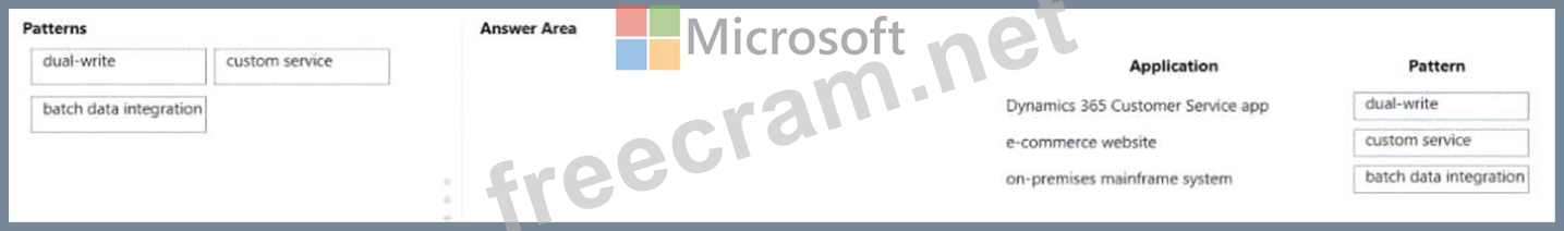 Which integration patterns should you use? To answer, drag the appropriate patterns to the correct applications. Each pattern may be used once, more than once, or not at all. You may need to drag the split bar between panes or scroll to view content. NOTE: Each correct selection is worth one point.