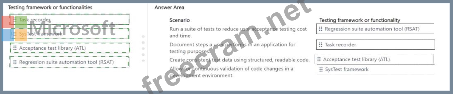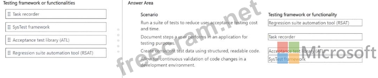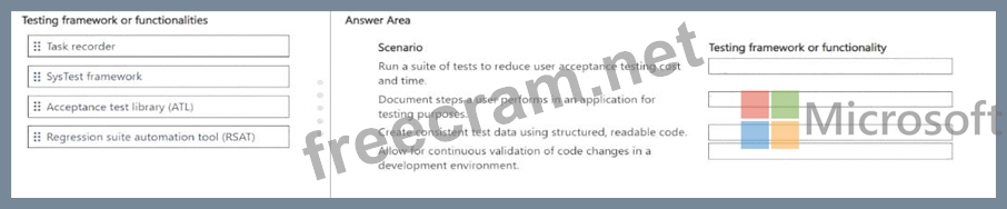 Which testing framework or functionality should you use in each scenario? To answer, drag the appropriate testing frameworks or functionalities to the correct scenarios. Each testing framework or functionality may be used once, more than once, or not at all. You may need to drag the split bar between panes or scroll to view content.