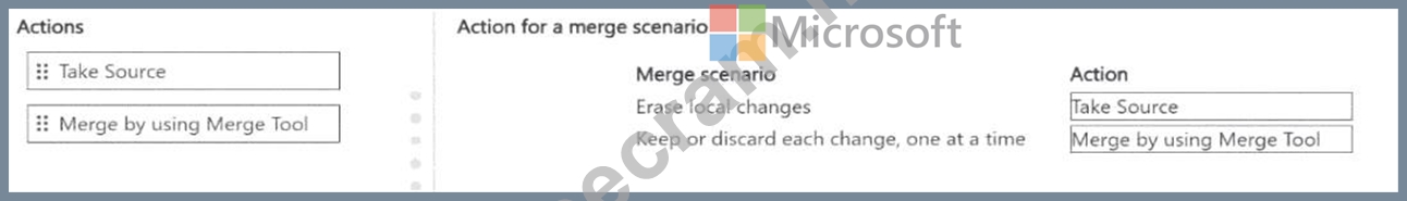 Which actions should you perform? To answer, move the appropriate actions to the correct merge scenarios.