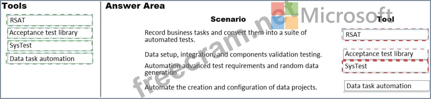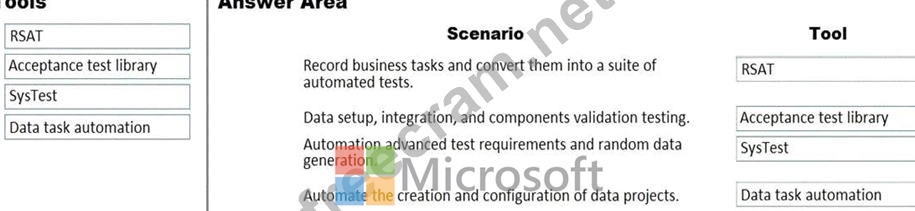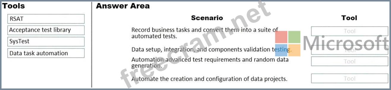 What should you recommend? To answer, drag the appropriate tools to the correct scenarios. Each tool may be used once, more than once, or not at all. You may need to drag the split bar between panes or scroll to view content.