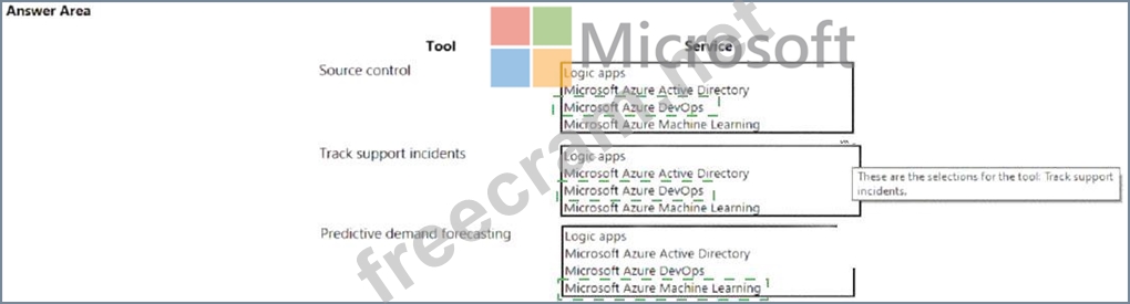 A client is implementing Dynamics 365 Finance. You need to help the client understand which Microsoft Azure tools to use to perform various tasks. What should you recommend? To answer, select the appropriate options in the answer area. NOTE: Each correct selection is worth one point.