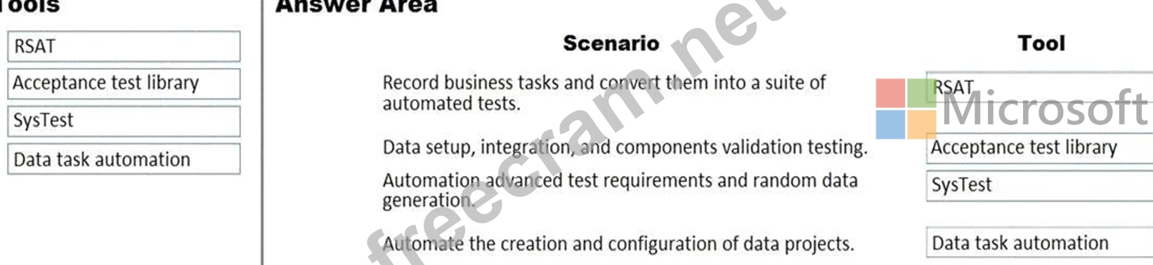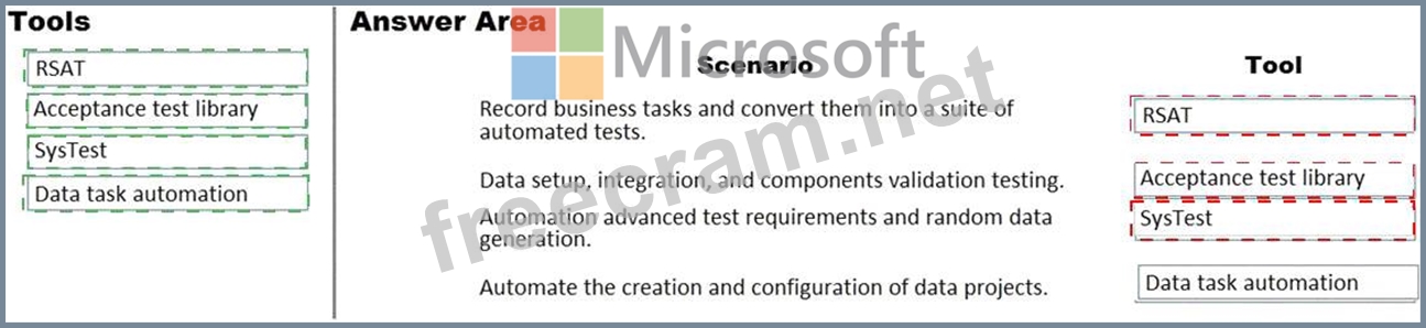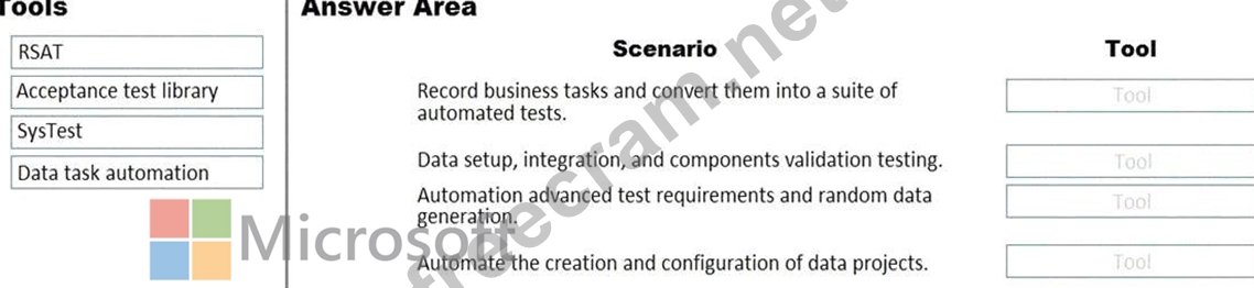 What should you recommend? To answer, drag the appropriate tools to the correct scenarios. Each tool may be used once, more than once, or not at all. You may need to drag the split bar between panes or scroll to view content.