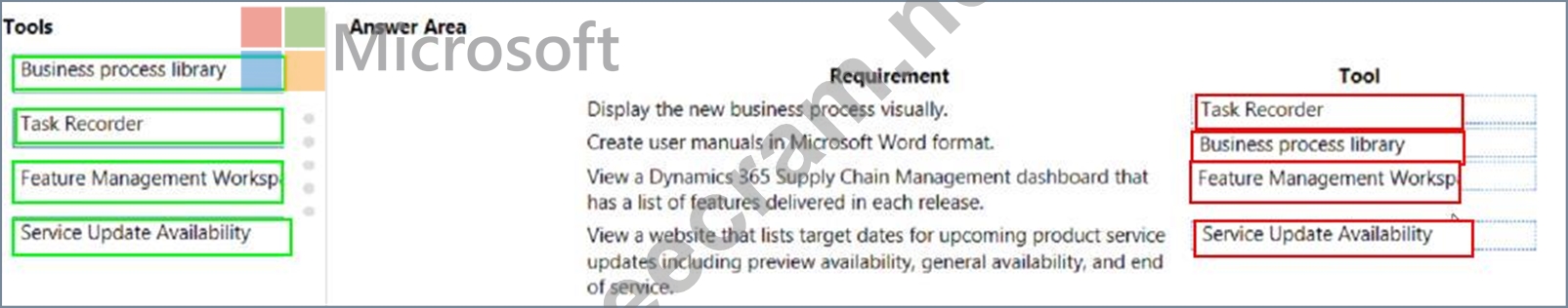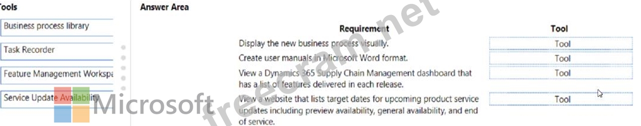 What should you recommend? To answer, drag the appropriate tools to the correct requirements. Each tool may be used once, more than once, or not at all. You may need to drag the split bar between panes or scroll to view content.