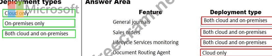 What should you recommend? To answer, drag the appropriate deployment types to the correct features. Each deployment type may be used once, more than once, or not at all. You may need to drag the split bar between panes or scroll to view content.