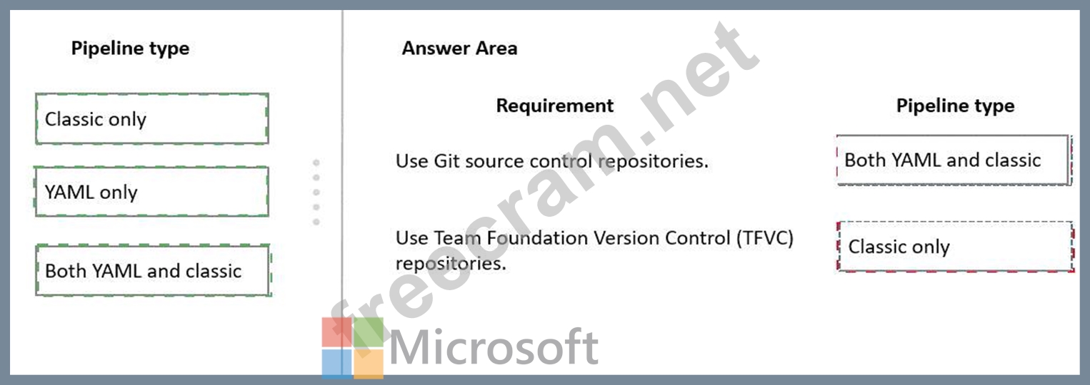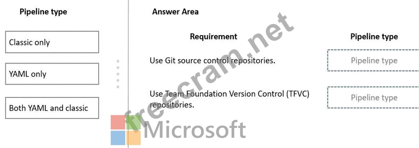 Which pipeline types should you recommend? To answer, drag the appropriate pipelines to the correct requirements. Each pipeline may be used once, more than once, or not at all. You may need to drag the split bar between panes or scroll to view content.