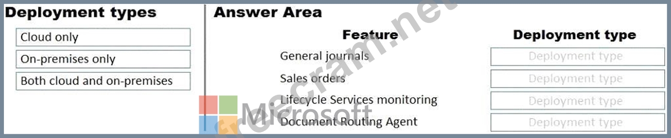 What should you recommend? To answer, drag the appropriate deployment types to the correct features. Each deployment type may be used once, more than once, or not at all. You may need to drag the split bar between panes or scroll to view content.