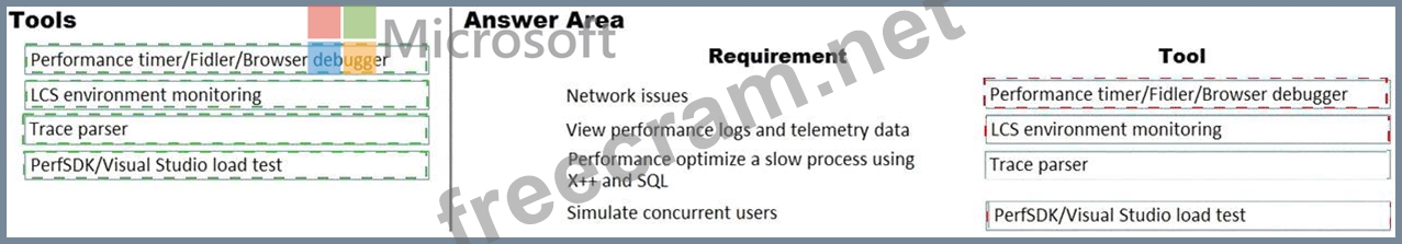 What should you recommend? To answer, drag the appropriate tools to the correct requirements. Each tool may be used once, more than once, or not at all. You may need to drag the split bar between panes or scroll to view content.