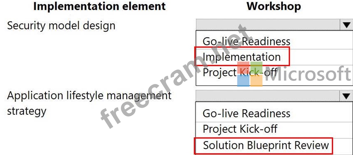 Which workshop covers each implementation element? To answer, select the appropriate options in the answer area.