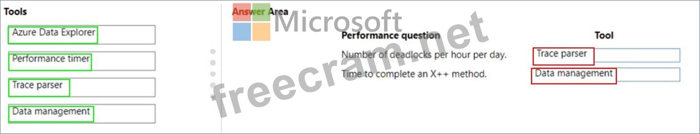 Which tools should you recommend? To answer, drag the appropriate tools to the correct performance questions. Each tool may be used once, more than once, or not at all. You may need to drag the split bar between panes or scroll to view content.