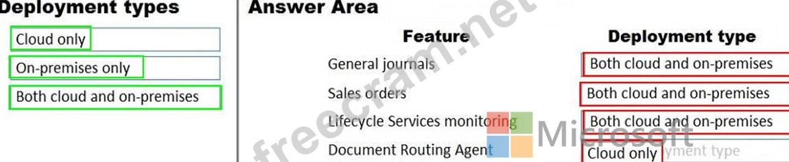 What should you recommend? To answer, drag the appropriate deployment types to the correct features. Each deployment type may be used once, more than once, or not at all. You may need to drag the split bar between panes or scroll to view content.
