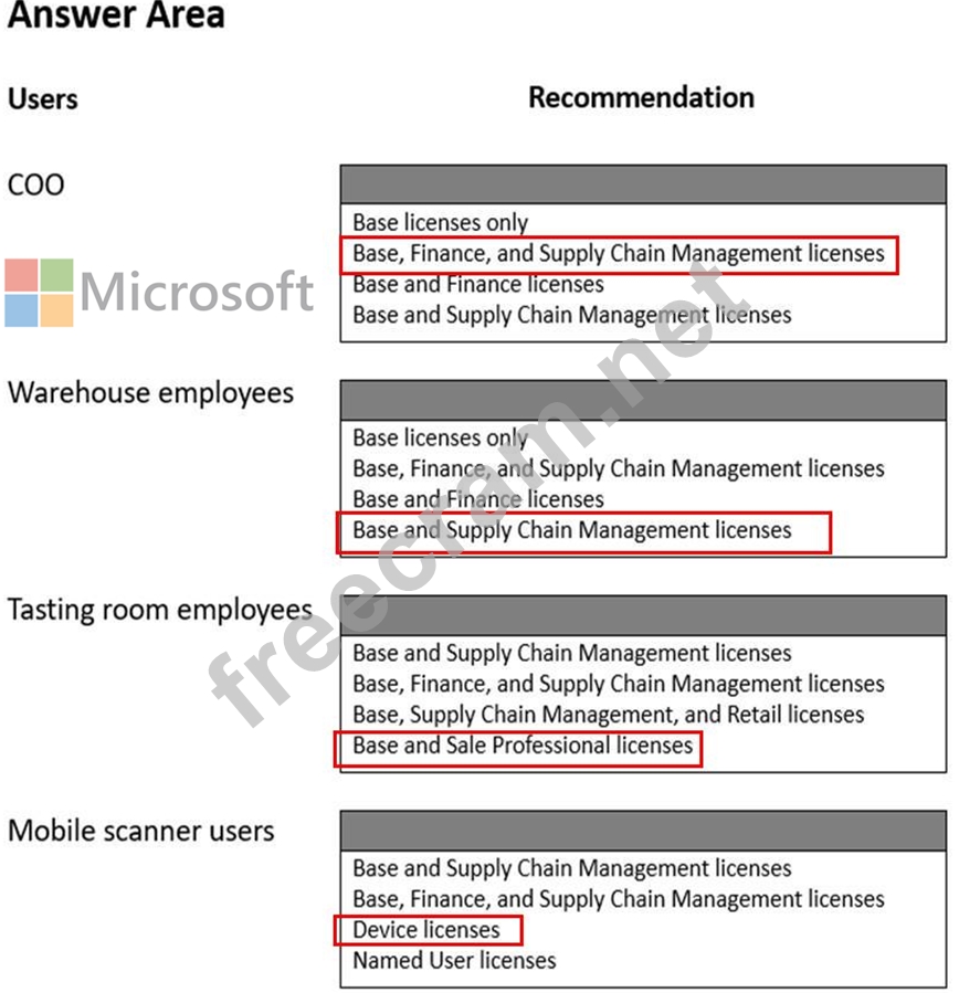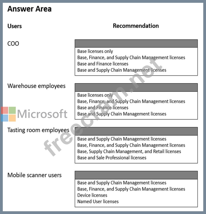 You need to recommend which type of Dynamics 365 licenses are needed.