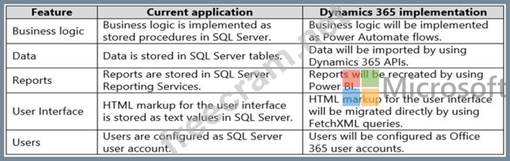 A company uses a legacy finance application that runs on a single SQL Server instance. The company plans to implement Dynamics 365 Finance. The following table describes the current implementation and design decisions for the new implementation: