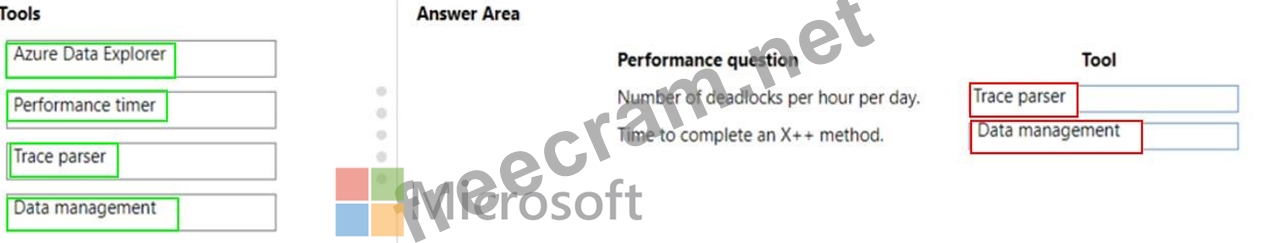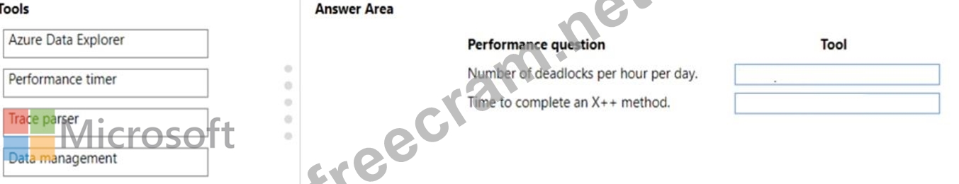 Which tools should you recommend? To answer, drag the appropriate tools to the correct performance questions. Each tool may be used once, more than once, or not at all. You may need to drag the split bar between panes or scroll to view content.