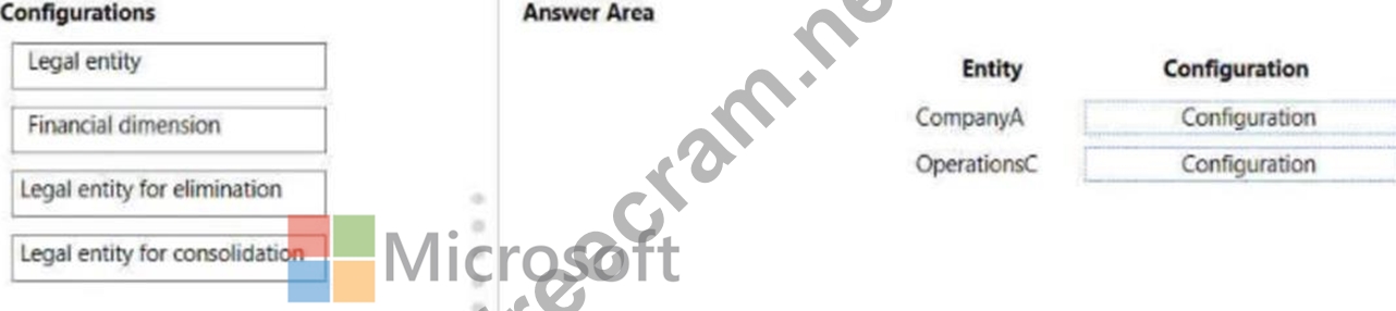 How should you configure the organization? To answer, drag the appropriate configurations to the correct entities. Each configuration may be used once. more than once. or not at all You may need to drag the split bar between panes or scroll to view content.