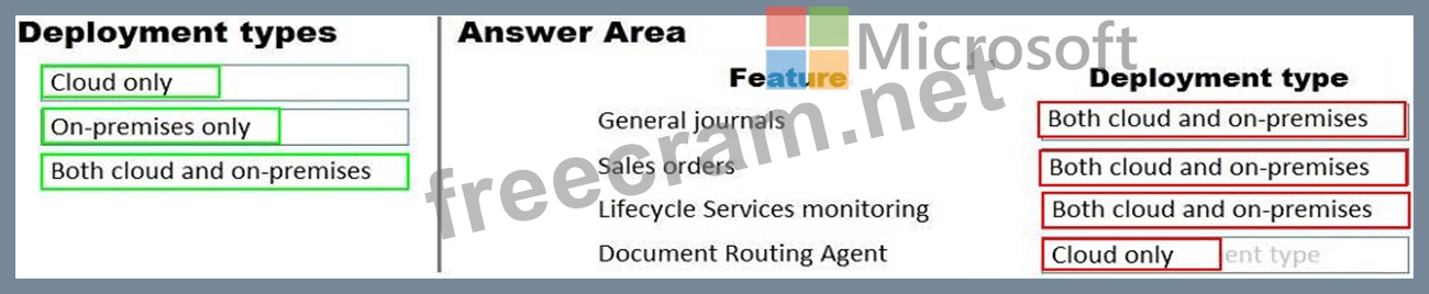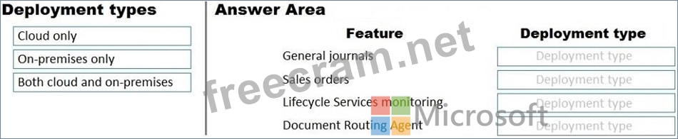 What should you recommend? To answer, drag the appropriate deployment types to the correct features. Each deployment type may be used once, more than once, or not at all. You may need to drag the split bar between panes or scroll to view content.