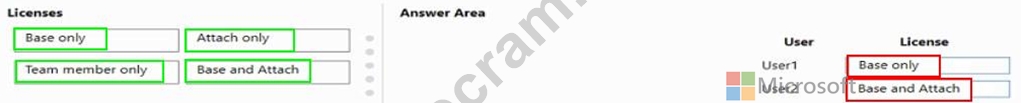 What should you recommend? To answer, drag the appropriate licenses to the correct users. Each license may be used once, more than once, or not at all. You may need to drag the split bar between panes or scroll to view content.