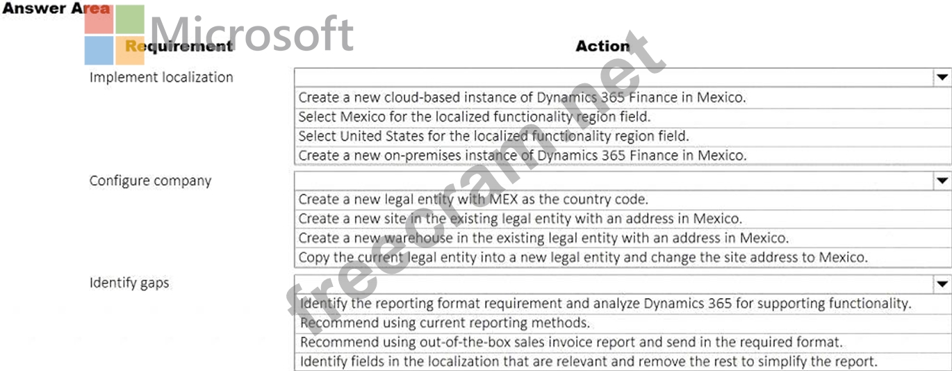 You need to recommend a solution that meets Mexican localization reporting requirements. What should you recommend? To answer, select the appropriate options in the answer area. NOTE: Each correct selection is worth one point.