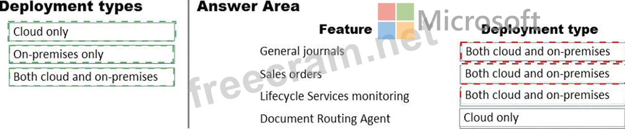 What should you recommend? To answer, drag the appropriate deployment types to the correct features. Each deployment type may be used once, more than once, or not at all. You may need to drag the split bar between panes or scroll to view content.